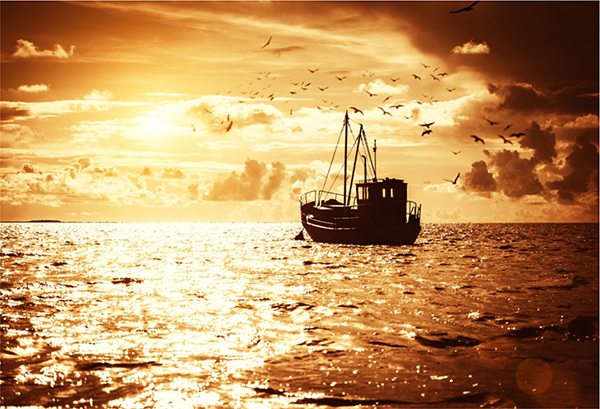 下午的太阳照在海面上,波光粼粼,大船远去,渐渐融入波光里。